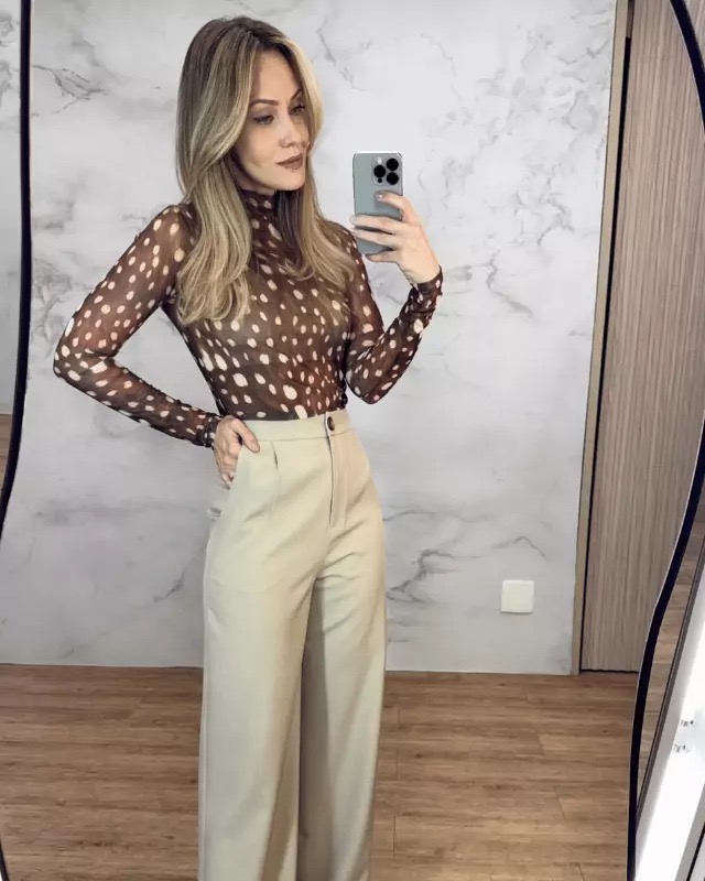 P (36/38) Busto 86cm, Comprimento Manga 61cm, Comprimento 60cm. Blusa básica em tule estampado. Composição 98% Poliester e 2% Elastano