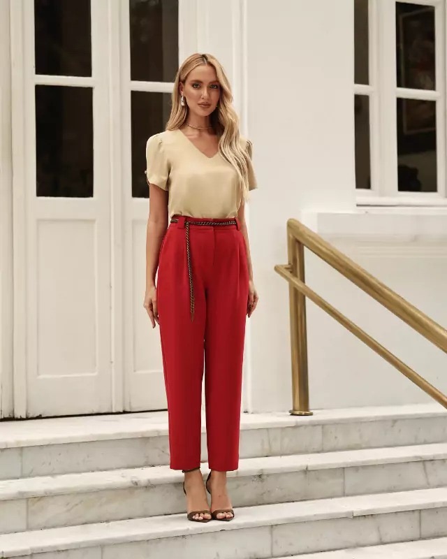 (38) Cintura 72cm, Quadril 102cm, Comprimento 98cm. Calça ballon em alfaiataria mista de viscose com elastano. Possui cós com colchete interno, zíper de nylon, passante, bolso, pregas e forro. Composição 76% Poliéster, 20% Viscose e 4% Elastano. Forro100% Poliéster.